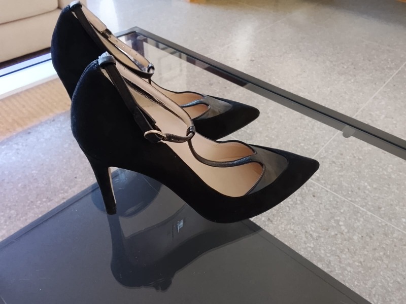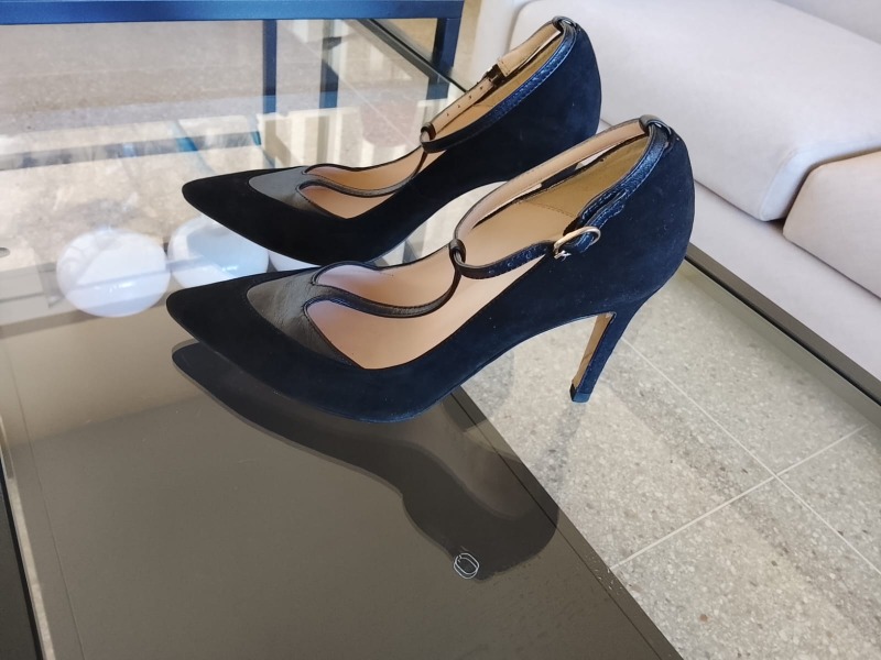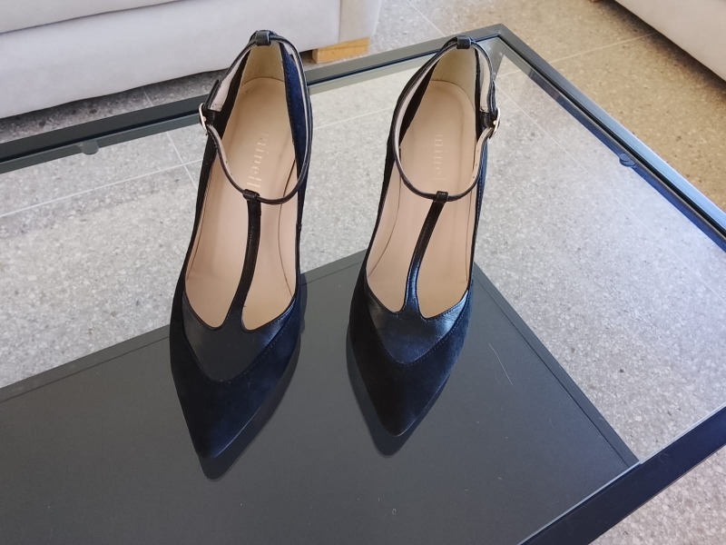 Escarpins très élégants pour sortir, marque Minelli ; en daim noir sauf la bride qui est en cuir mat Talons fins de 8 cm Vendu cause impossibilité de porter des talons ; pointure indiquée 36 Acheté :1300 dh neuf Magasin Minelli